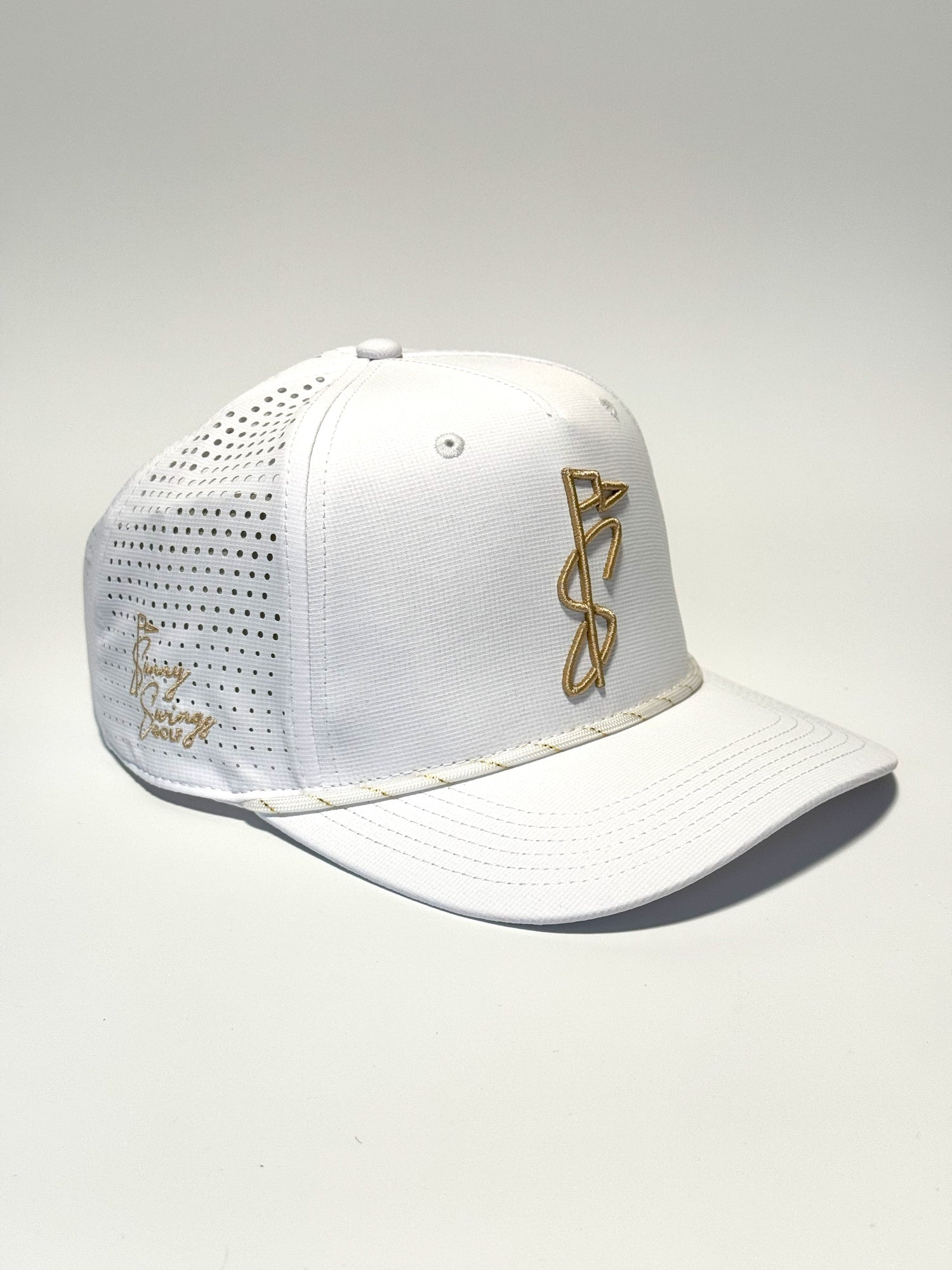 A bold, vibrant white and gold hat that commands attention with its clean contrast and luxe shine - perfect for making a confident statement on or off the course.
